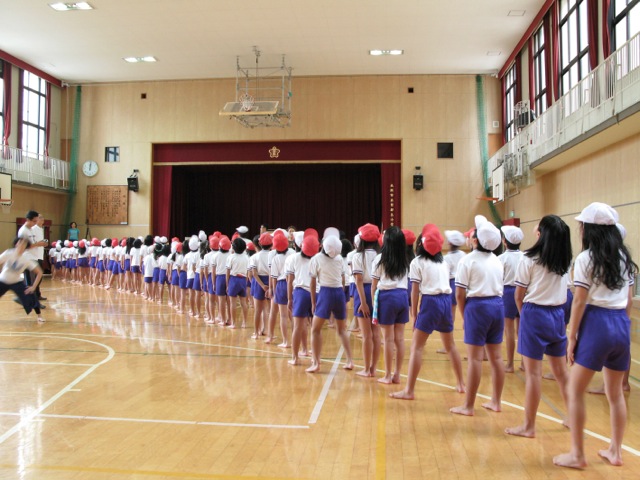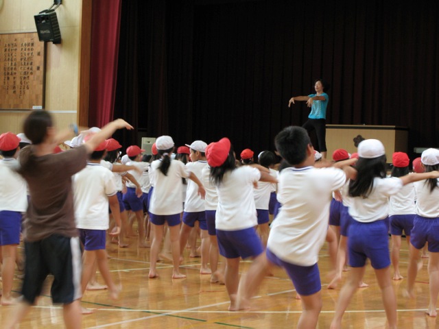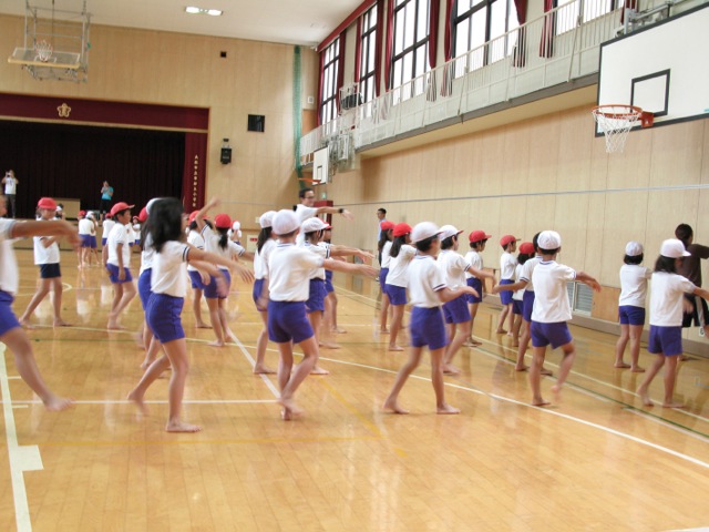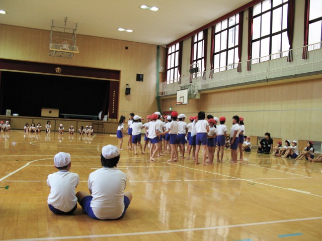 3年生から始まり、4年生で終わり、一安心したところで、「もう一回!3年生、さっきよりもがんばってみよう!」と北村さんの声があがる。こどもたちも「とことんやるぜ!」な勢い。中には体力がくたばって端っこで休憩する子もちらほらしています。