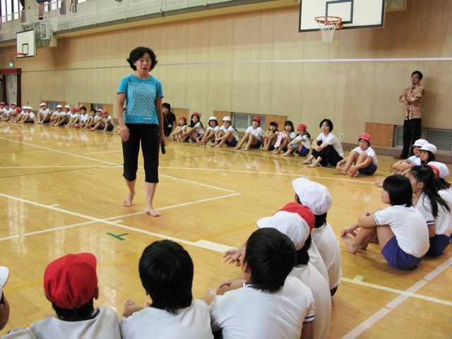 次に、手招きをして2学年のこどもたちが北村さんを囲むように集まります。声はマイクを通して小さくしゃべります。「みんなの顔がみえるように」と合図をして、こどもたちは体育館にだまって大きな円になって座ります。 「顔見えてるー?」と北村さんも声を出して緊張を盛り上げます。この円の中で、各クラスそれぞれで練習して来た事を発表することになりました。座ってる人はしっかり踊ってる人のことを見ること。しゃべる必要も打ち合わせも必要もないです。「しっかり踊りを見ることで、緊張して踊る人も踊りがきれいになるから」こどもたちは今まで練習して来たことを実践するのに、恥ずかしいのかもたもたしています。3年生から発表していき、各クラスごとにどう見えたかこどもたちが感想を言い合います。「円の端っこの方で固まってた」「ちゃんと相手の目をみてない」といろいろクレームばかり。「おかしいことに気づいた人はその気づいたことを治すように!」と北村さんが言うと、4年生たちは自分たちが言った手前しっかりせねばと、緊張がさらに増します。