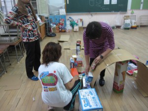 さて、いよいよ組み立てです。前の時間に補強した箱を並べて、イグル―の形を作ります。前もって、三原さんがそれぞれのイグル―の形に、床に赤いテープを貼っておいてくれました。