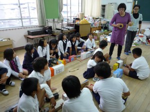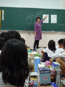 「牛乳パックは、頑丈なので、補強しなくても大丈夫です。組み立て方は、こうします…。」そういって、牛乳パックの開いた部分を折りたたみ、直方体にする方法を説明。その鮮やかさと、出来上がった箱のきれいさに、「お~、すげ~!」と子どもたちから拍手が起こります。