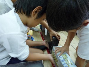 早速、自分たちもやっていみたい!と、子どもたちのやる気がムクムク。三原さんの説明が終わるやいなや、牛乳パック探し始めます。さっきの話のように作ることができると、とても嬉しそうでした。