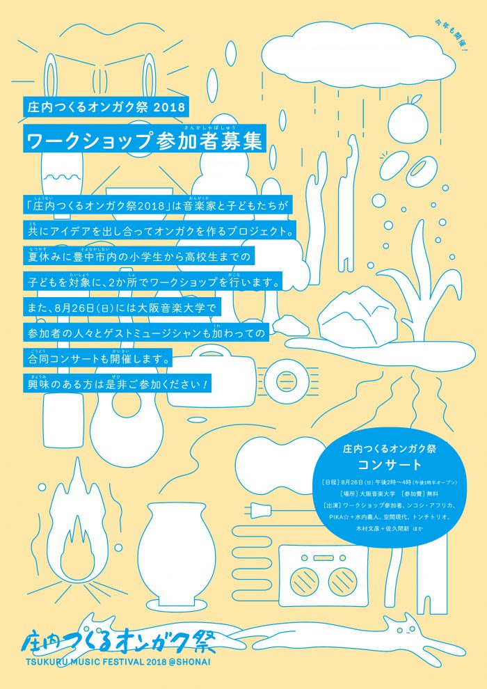 「庄内つくるオンガク祭2018」は音楽家と子どもたちが共にアイデアを出し合って音楽を作るプロジェクト。夏休みに小学生から高校生までの子どもを対象に、2組のアーティストユニットそれぞれ6回ワークショップをおこないます。
